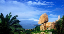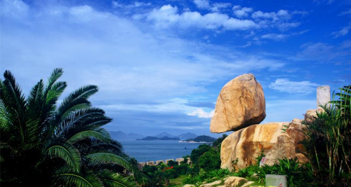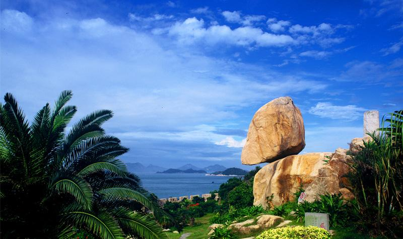 東山風動石位于福建省漳州市東山島,以奇、險、懸而居全國60多塊風動石之最,被譽為“天下第一奇石”。它是東山島的標志性景觀。正可觀其偉,側可觀其奇,背可觀其險。從背面看,狀如玉兔的石巖伏在外傾的石盤上,巨大的石球,懸空而立,搖搖欲墜,令人心怵;從正面看,石如蟠桃,底部呈圓弧形,貼石盤處尖端僅數寸,懸空斜立,狂風吹來,搖晃不定。