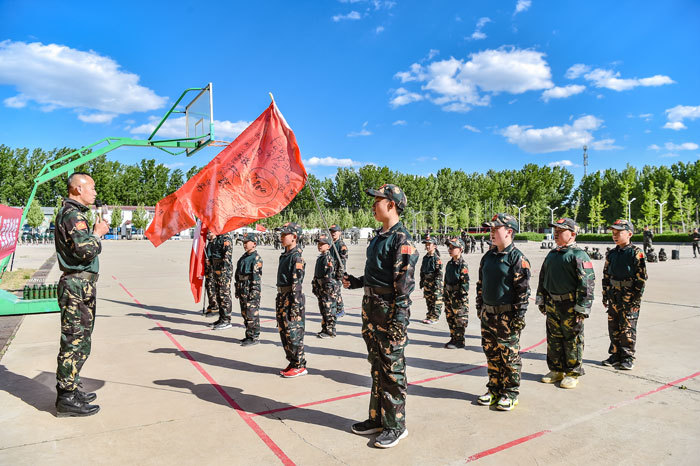 開營儀式:任命各級訓導人員并進行授旗儀式集體宣誓承諾,教官、學員發言;設計隊名隊旗、立“軍令狀”,讓大家更有擔當,更有責任意識,簽訂軍令狀,簽在了紙上,更是簽給了自己,讓每一個軍人在遇到困難和挫折時都不會退縮。更多體現的是承諾。
