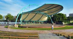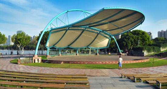 露天音樂廣場:倚坡而建的露天劇場位于世紀公園西側,占地面積8000平方米,前區觀眾席可容納人數2500座,全開放條件下可接待游客4000人次。觀眾席前設舞臺及音樂罩、燈控、控及一些輔助用房,其規模目前是全國最大的人造露天劇場。這白色鋼膜制成的音樂罩是用于增強音響效果的,它可以將演唱者的聲音匯集起來傳向觀眾,聲音異常清晰、響亮。廣場面向綠水、背倚山林,游客在此無論是欣賞還是自娛演唱,都不失為莫大的享受。