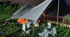帳篷露營:兩房一廳,一屋一廳,1.0_1.5-1.8米寬充氣床墊、枕頭、睡袋、床單及被子并配有天幕桌椅,水電方便。