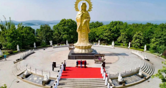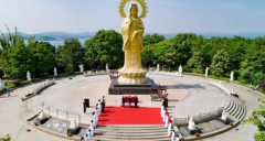 觀音島中矗立著高18米的雙面滴水觀音,金光閃閃,莊嚴肅穆,周圍33尊觀音化身栩栩如生。這些觀音化身或立或臥,有的騎著坐騎,有的坐于蓮臺之上,慈眉善目、嘴角含笑,行走其間,叫人頓感身處仙境。