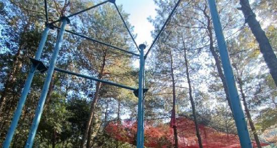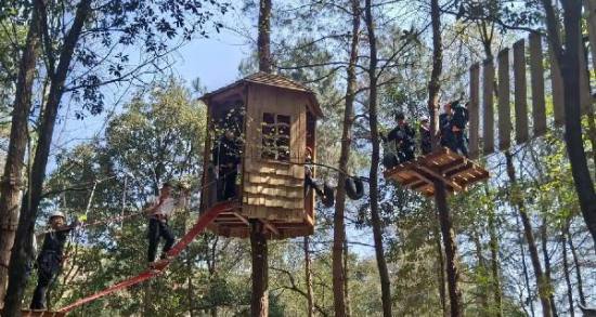 盤龍谷團建拓展基地的場地設在高大的松樹林中,茂密的樹林阻擋陽光,即使在大夏天也能避免太陽的暴曬