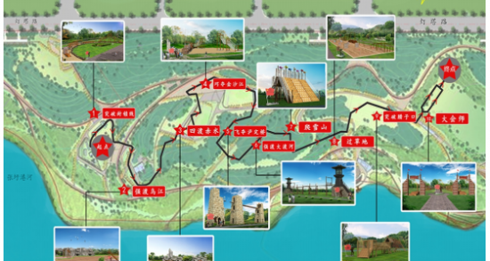 10.勝利大會師。歷史背景:1936 年 10 月,紅軍三大主力在甘肅會寧勝利會師,從而結束了具有偉大歷史意義的長征,這是中國革命史上的偉大創舉,也是中國革命由挫折走向勝利的偉大轉折。項目設置:秋千橋、勇士穿越、攀網過河、沼澤跳躍、會師臺。項目占地:總長 600m,寬 25m。
