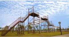 4.巧奪金沙江。歷史背景:為調動敵人,尋找戰機,紅軍在毛澤東的指揮下,乘虛進軍云南,隨后巧奪金沙江,擺脫了幾十萬敵軍的圍追堵截。項目設置:勇者之路、翻越高山、飛躍天塹、猛虎下山。項目占地:總長 140m,寬 8m。