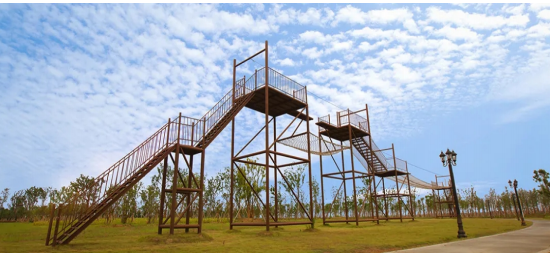 5.強渡大渡河。歷史背景:大渡河是岷江最大的支流,兩岸壁林立,水流湍急,能否渡過大渡河,關系到數萬紅軍將士的生命,英勇的戰士們冒著槍林彈雨,在驚濤駭浪中向對岸沖去,終于打開了天險大渡河的一個缺口。項目設置:中空平衡。項目占地:總長 61m,寬 10m。